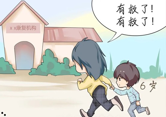 上图为:四格漫画图二,妈妈牵着小男孩奔向康复机构的大门,脑袋里冒出一个气泡,气泡中写着黑色大字:有救了!有救了!画面右下角有两个大字:6岁。